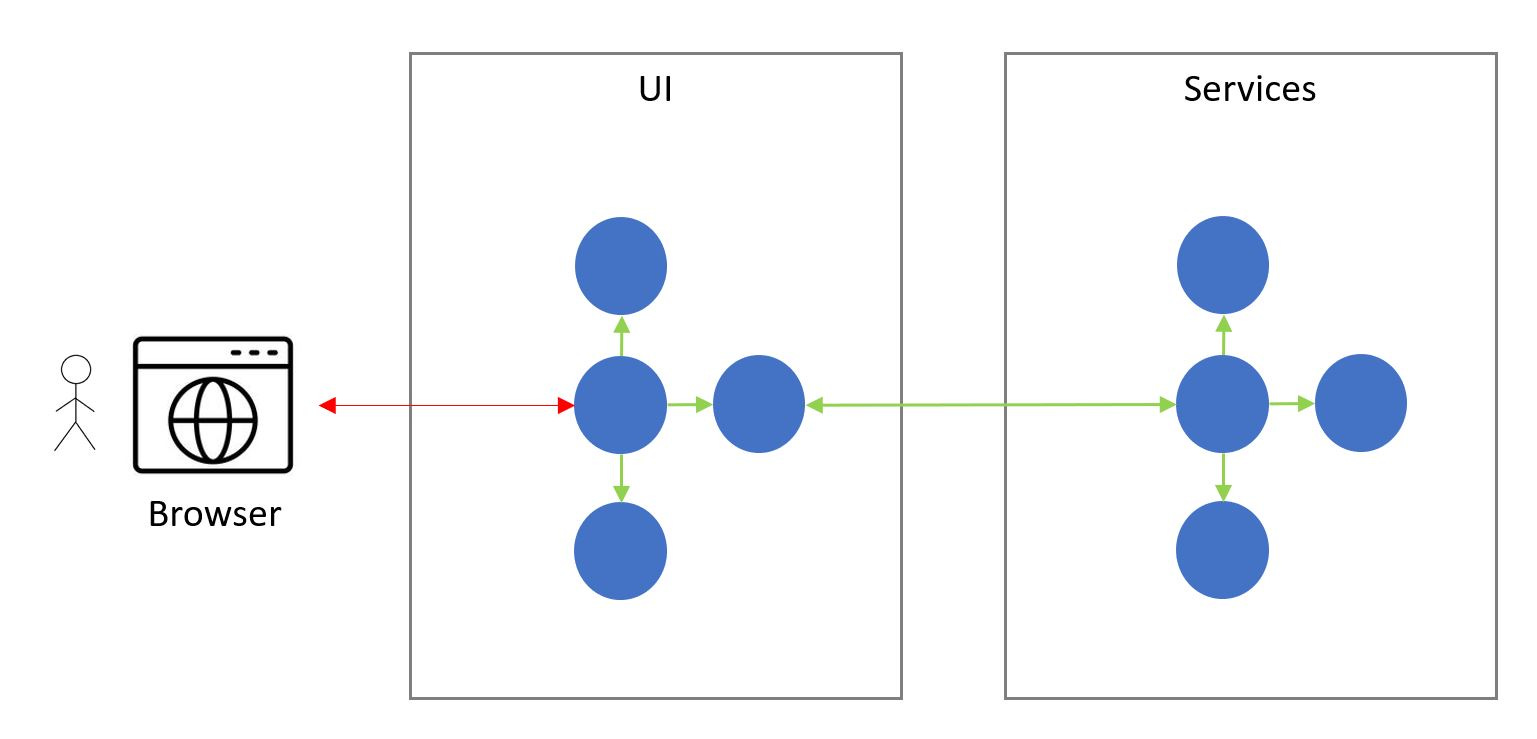 Beyond being brittle, unreliable and slow, the major problem with UI-based tests is that they simply don’t test enough combinations. Consider the following rather generic example of an architecture. It is a case where a browser interacts with the UI (written in a framework like React) and the React app calls a service layer which in-turn, calls other services or databases to eventually return a response to the user.
